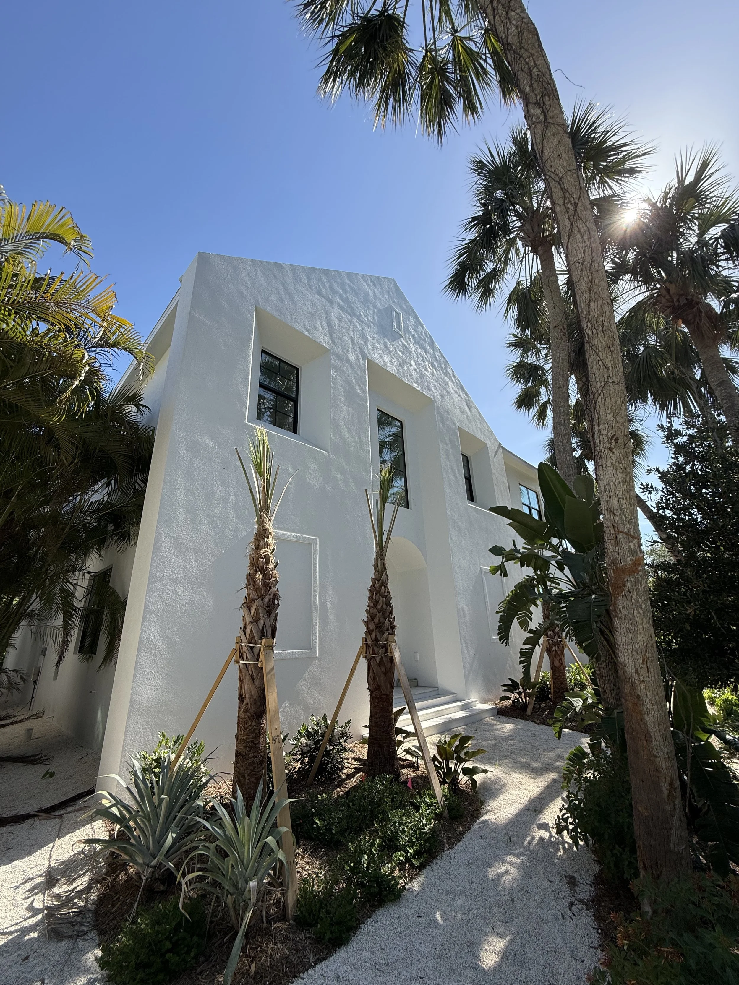 White modern house with a textured exterior, surrounded by tropical palm trees and plants underneath a clear blue sky and sunlight.